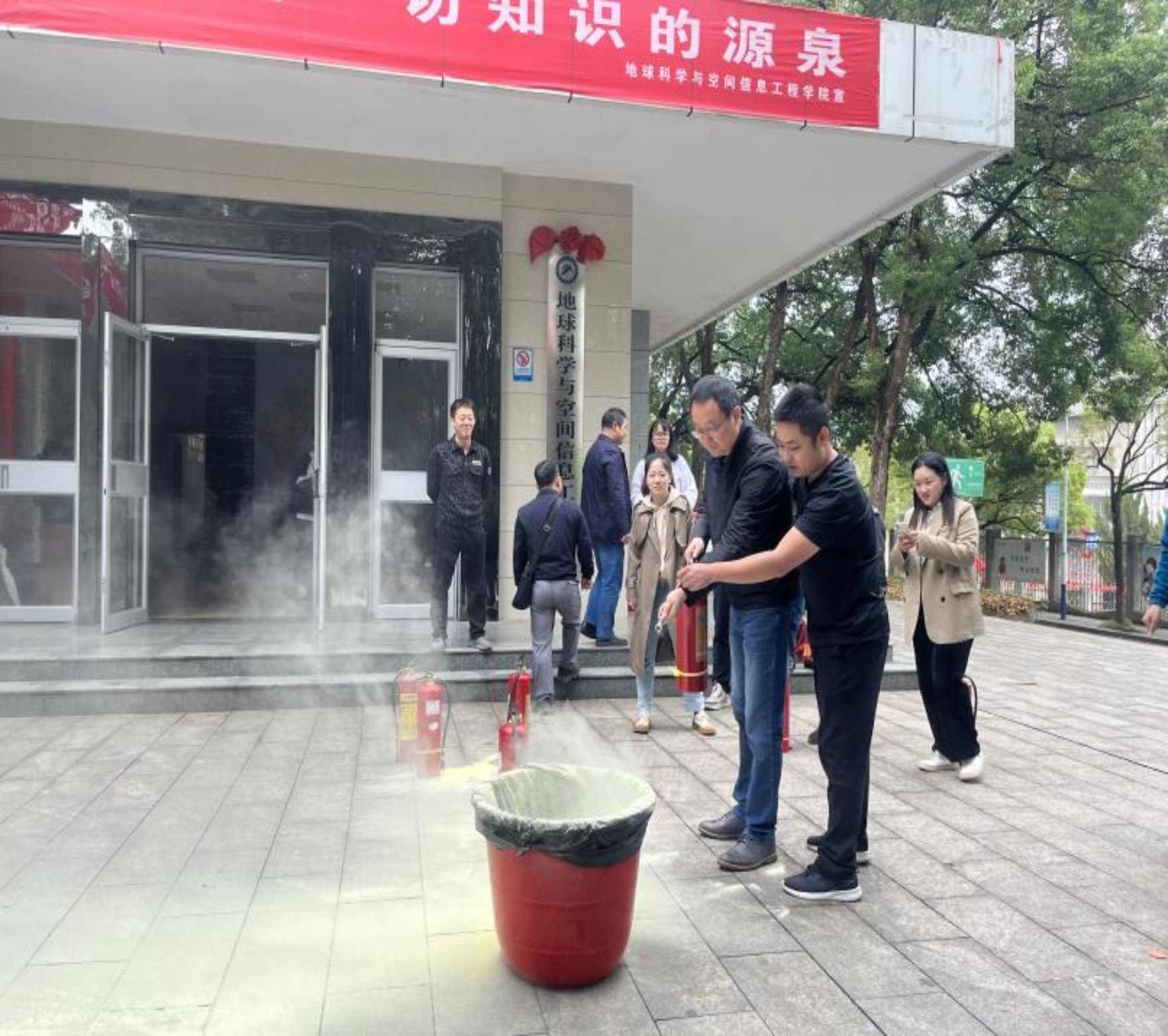 “对我们日常生活中常见的手提式灭火器,做到如下步骤。一看。看消防器材是否在保质期内。二拔。拔掉保险销,一手开启压把,另一手握喇叭喷桶的手柄,紧握开启压把即可喷出。要注意的是要距离燃烧处1.5米左右......”消防员周老师边操作边讲解,旁听者凝神屏气,全心贯注静静聆听着。在周老师的指导下,在场的没有实操过的老师和学生进行了体验操作。大家纷纷表示这是一场别具生动的实践教学,在教学中领悟自己职责,加强了不忘初心的党员信仰和真正碰到消防安全时的底气自信。