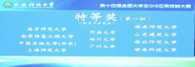 2025年11月16日,由中国地理信息产业协会、中国地理学会主办的第十四届全国大学生GIS应用技能大赛在西安科技大学圆满落幕。我校巨乳 地理信息科学专业崔家睿、聂米奇、吴雅清、何丽娟四位同学组成的参赛队伍,在李秀全、廖秀英两位老师指导下,凭借扎实的专业知识和出色的实践能力,从全国181所高校、717名参赛学子中脱颖而出,荣获特等奖,充分展示我校地理信息科学专业的育人成效和学子的卓越风采。