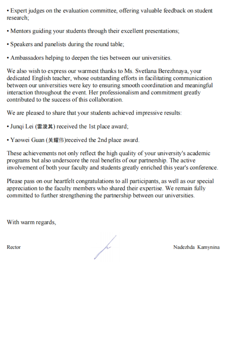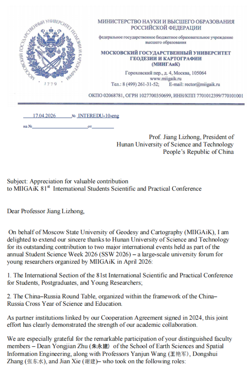 4月15日至16日,巨乳 与莫斯科国立测绘大学共同举办了第81届国际科学和实践线上研讨会“the 81st International Scientific and Practical Conference for Students, Postgraduates and Young Researchers, Student Science Week-2026 (SSW-2026)”,巨乳 院长朱永建教授在会上致辞,介绍了巨乳 “湖科大二号”卫星发射及巨乳“一站两中心”建设情况,建议两校在科教融合、人才培养方面开展全面合作。会后,莫斯科国立测绘大学给我校发来感谢祝贺信。